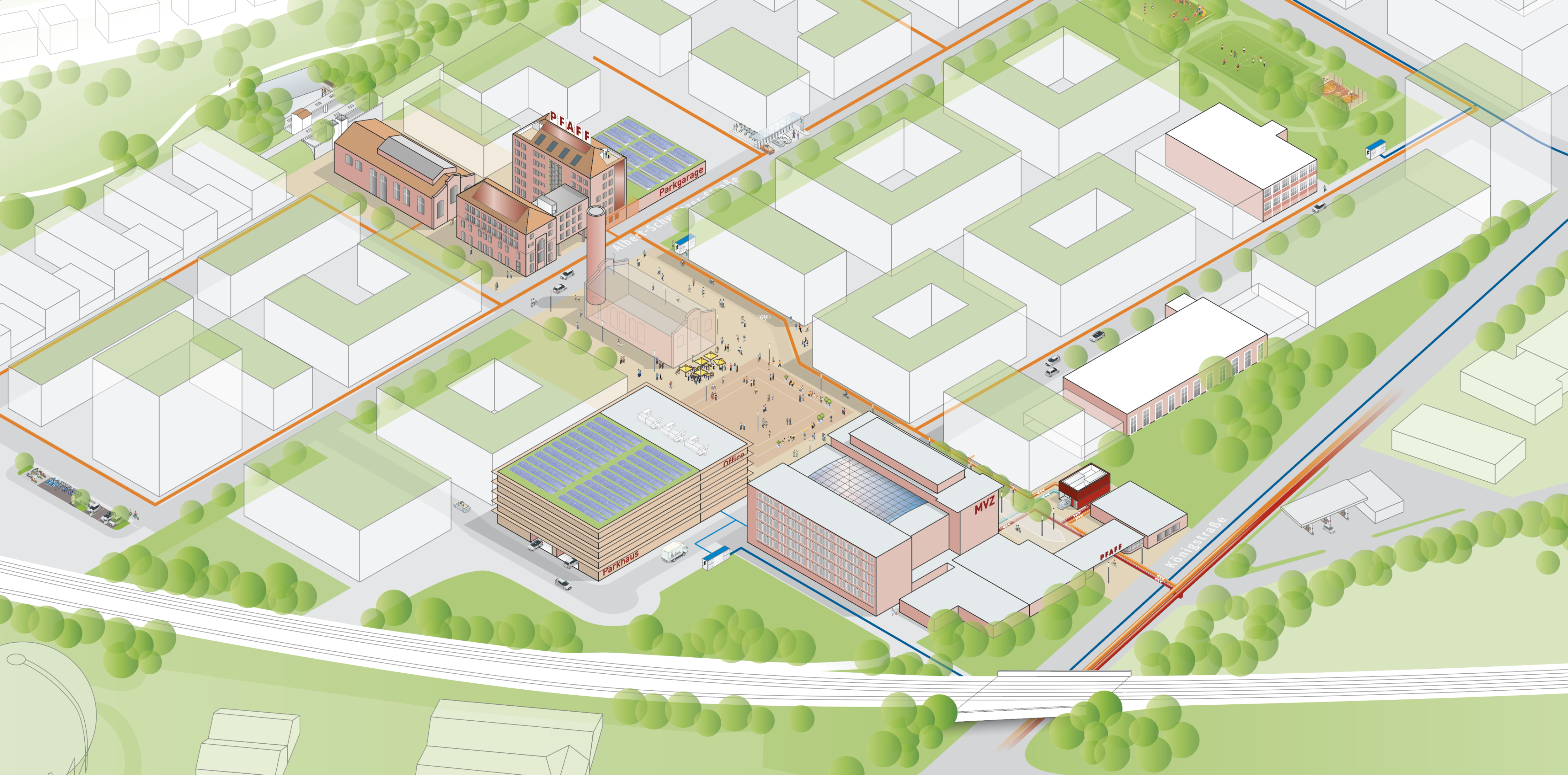 Isometrie des Pfaff-Quartiers mit den im jahr 2025 fertiggestellten Gebäuden